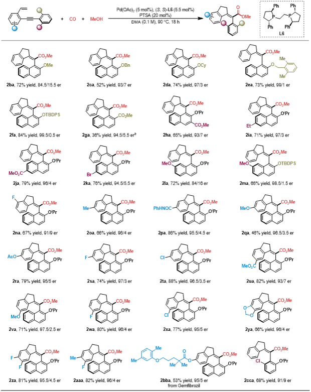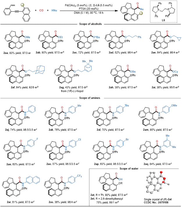 作者以2-异丙氧基-1-((2-乙烯基苯基)乙炔基)萘1a作为模板底物,甲醇作为亲核试剂,以Pd(OAc)2作为催化剂,(S, S)-Ph-BPE (L6)为手性配体,对甲苯磺酸作为酸,N,N-二甲基乙酰胺作为反应溶剂,在10 大气压的 CO氛围下90 ℃反应18小时即能以83%的分离产率以及97:3 er值分离得到轴手性甲酯产物2aa。在最优条件下,作者考察了不同种类亲核试剂在反应中的兼容性(图2)。结果表明,多种醇、胺以及水作为亲核试剂,都能以较好的产率和对映选择性得到所需要的轴手性苯乙烯羰基化合物。随后,作者系统考察了烯炔底物取代基对反应活性及对映选择性的影响(图3)。研究表明,烯炔底物萘环邻位上的取代基位阻对反应的对映选择性有较大影响,产物的er值随着取代基位阻增大而增加。其他位置的取代基对反应的影响不大,都能以中等至良好的收率和优秀的对映选择性得到目标产物。