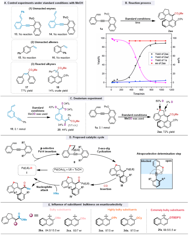 为探究反应机理,作者进行了一系列控制实验:在标准条件下以甲醇作为亲核试剂,对一系列不同底物进行了对照实验(图5A)。首先,含有内烯结构单元的1,5-烯炔13或含有烷基烯烃的1,6-烯炔14在标准条件下均不反应,表明底物中的末端苯乙烯结构单元不可或缺。有趣的是,当使用没有邻位炔基取代的简单苯乙烯(15和16)时,均未观察到烷氧羰基化产物,说明炔基部分对启动羰基化过程至关重要。此外,虽然二苯乙炔可顺利发生烷氧羰基化,并以77%产率得到17,但空间位阻更大的二芳基炔仅以极低产率给出化合物18,说明大位阻的炔烃底物在催化体系下活性确实有所降低。以上结果证明,作者最初设计的1,5-烯炔化合物中苯乙烯结构单元对启动该羰基化反应起关键作用,并且空间位阻大的炔基部分对改变Pd-H物种的插入顺序也十分重要。为进一步验证该Pd/(S, S)-L6催化羰基化优先启动在烯烃单元而非炔烃单元上,用MeOD对1-(苯乙炔基)-3-乙烯基苯19进行氘标记实验(图5C,左),以44%的产率观察到炔烃羰基化产物20,区域选择性为1/1。有趣的是,未反应的乙烯基上检测到34-43%的氘标记,表明Pd-H物种可以插入烯烃,但随后的羰基化反应并未发生,而是可逆的发生β-氢消除。这些结果表明,手性配体的选择对化学选择性羰基化(2aa vs 2aa’)同样至关重要。在另一组底物1a的氘标记实验中(图5C,右),氘仅标记α位(60%),β位无标记,支持Pd-H物种对1a中乙烯基的β-选择性插入是不可逆的。在1a与甲醇反应的动力学曲线中(图5B),可观察到明显的诱导期,这可能归因于Pd(II)还原为Pd(0)生成Pd-H物种的过程。随后,伴随底物1a被消耗,目标产物2aa的产率逐渐升高,但其ee值始终保持在94%,并且反应历程中未检测到其他中间体。基于上述实验结果以及前人报道,作者提出了如图5D所示的催化循环。首先,由Pd(OAc)₂、L6和TsOH生成的Pd-H物种(I)对乙烯基进行β-选择性插入,形成烷基-Pd中间体II。随后,II与炔基发生5-exo-dig环化,生成轴手性烯基-Pd中间体III。接着CO插入将III转化为酰基-Pd中间体IV,后者被亲核试剂捕获,得到目标产物并再生Pd-H物种(I),完成循环。为进一步理解该反应的对映选择性,作者提出了决定手性步骤(中间体II)的空间模型(图5D,右)。较大的取代基RL占据开放空间位置,而较小的取代基(RS)被限制在受阻区域。因此,苯环两侧的空间位阻差异(RL vs RS)对反应的手性诱导起决定性作用。这一解释合理说明了2ka中由于RL与RS位阻差异极小,仅获得中等er值(84/16)。此外,从2ba、2ca、2aa、2da到2fa,对映选择性逐步提升(er从84.5/15.5增至99.5/0.5),也可归因于底物上取代基体积逐渐增大,这一点可通过相关的取代基参数加以分类(图5E)