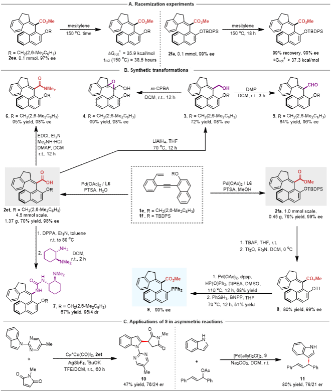 在得到这些轴向手性苯乙烯后,作者以2ea和2fa为代表,测定了它们的旋转能垒(ΔGrot‡),以评估构型稳定性(图4a)。结果表明,2ea的ΔGrot‡ 为 35.9 kcal mol⁻¹,对应150 °C下半衰期38.5 h(图4a,左);而2fa的ΔGrot‡ 更高,在同等温度下18 h内未观察到任何消旋现象。这些结果证明了作者设计的轴手性环外四取代烯烃的超稳定结构(图4a,右)。作者进一步对这两种保护基产物进行了放大和后续官能团转化(图4b),包括还原、氧化和Curtius重排等反应。值得一提的是,作者基于合成的构象稳定骨架,发展了一类全新的轴手性苯乙烯单膦配体,并在钯催化不对称烯丙基取代反应中初步证明了其手性诱导能力。