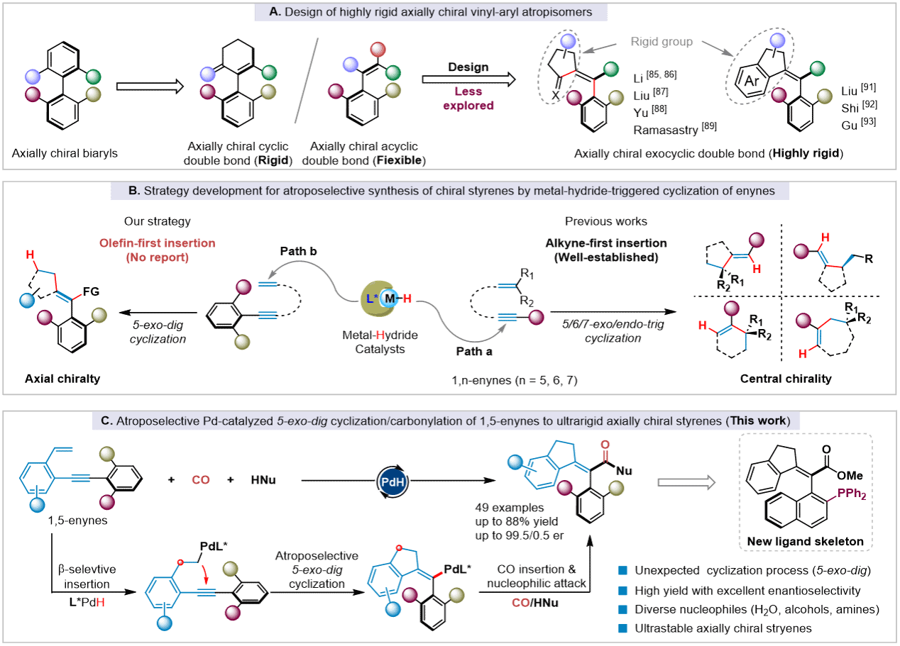 为了实现上述目标,刘家旺团队基于前期在轴手性化合物合成以及羰基化反应开发方面的经验(J. Am. Chem. Soc. 2025, 147, 23946;Angew. Chem. Int. Ed. 2025, 64, e202413949;Nat. Commun. 2024, 15, 7248;Angew. Chem. Int. Ed. 2025, 64, e202413949),基于以下几点考虑,设计了邻位炔烃取代的苯乙烯底物:(1)烯烃和炔烃之间芳基的引入,不仅能够提供产物环外双键的刚性基团,增强产物稳定性,还能将烯烃部分变为端位苯乙烯,烯烃反应活性得到提升;(2)芳基的引入以及炔烃末端芳基邻位大位阻官能团的引入,增大了炔烃的空间位阻,使炔烃的反应活性降低。通过底物的理性设计,有效调整了烯炔底物中烯烃和炔烃的反应活性,成功实现了钯催化1,5-烯炔的不对称环化/羰基化反应,高效合成了一系列构型超稳定的轴手性苯乙烯,为轴手性苯乙烯的不对称合成与应用提供了新策略。