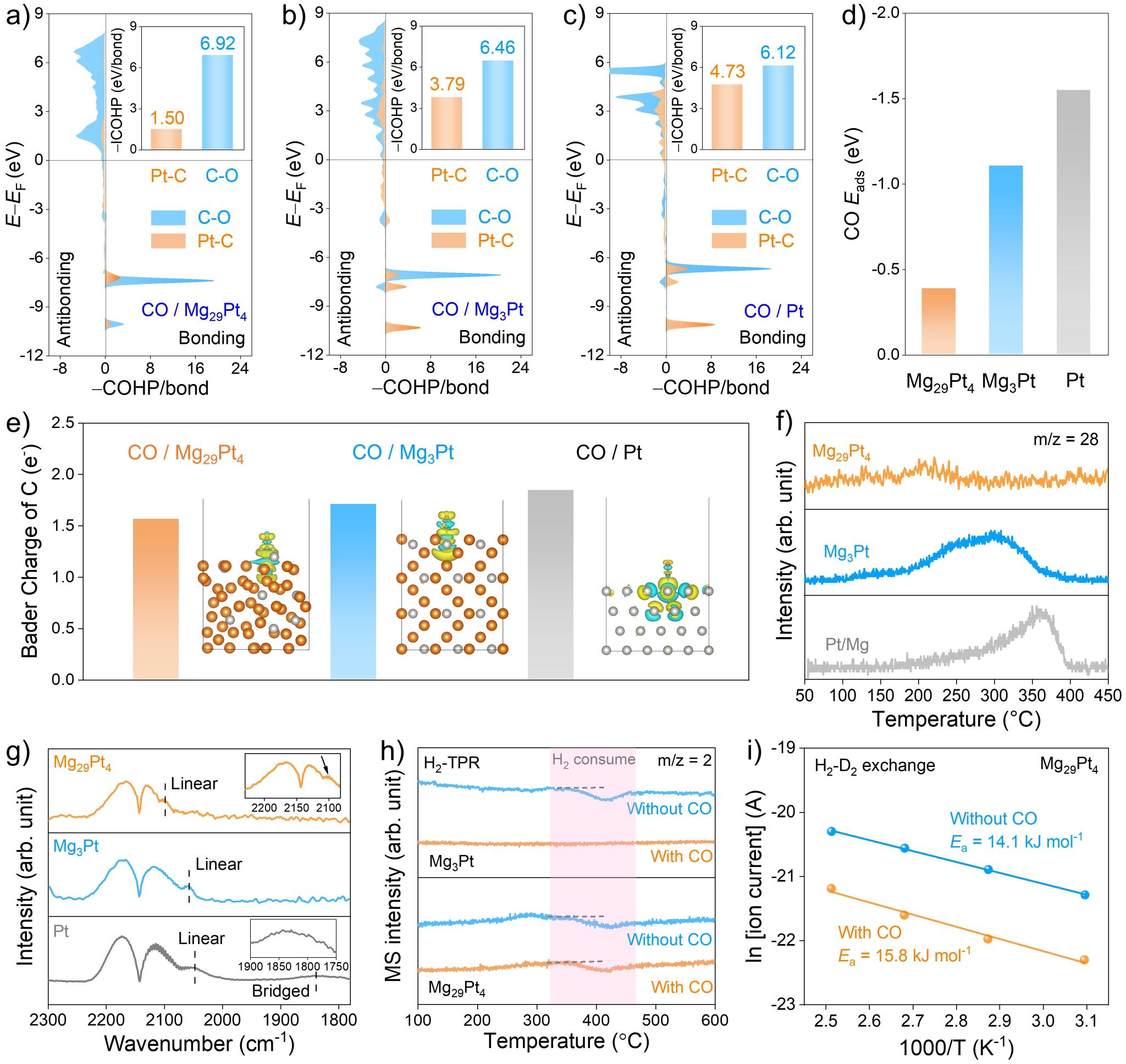 接着,作者研究了Mg29Pt4与Mg3Pt中Pt位点的电子结构。如图3e所示,Bader电荷计算结果表明,与Mg3Pt相比,Mg29Pt4中Pt位点的电子密度更高。此外,X射线吸收近边结构(XANES)与X射线光电子能谱(XPS)也证实,Mg29Pt4和Mg3Pt中的Pt位点均带负电荷,但Mg29Pt4中Pt位点的电子密度更高(图3g与3h)。更高的电子密度,可以降低Mg29Pt4材料中Pt位点的d带中心。如图3f所示,在Mg29Pt4中,Pt位点的d带中心为-3.36 eV,明显低于Mg3Pt中Pt位点的d带中心(-3.02 eV)。通常,更高电子密度,可以抑制CO分子中5σ轨道电子向Pt的5d空轨道转移,而较低的d带中心,可以弱化Pt的5d电子反向填充至CO的2π*反键轨道,从而提高催化剂材料的抗CO中毒性能。