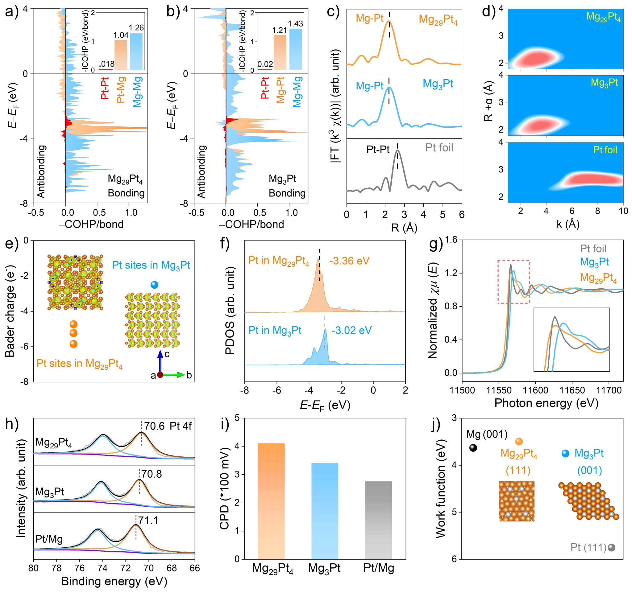 (2)在Mg29Pt4和Mg3Pt中,Pt位点均以单原子形式有序分布于对应的晶体结构中,但其电子结构却存在显著差异。其中,富镁型Mg29Pt4中的Pt位点具有更高的电子密度。