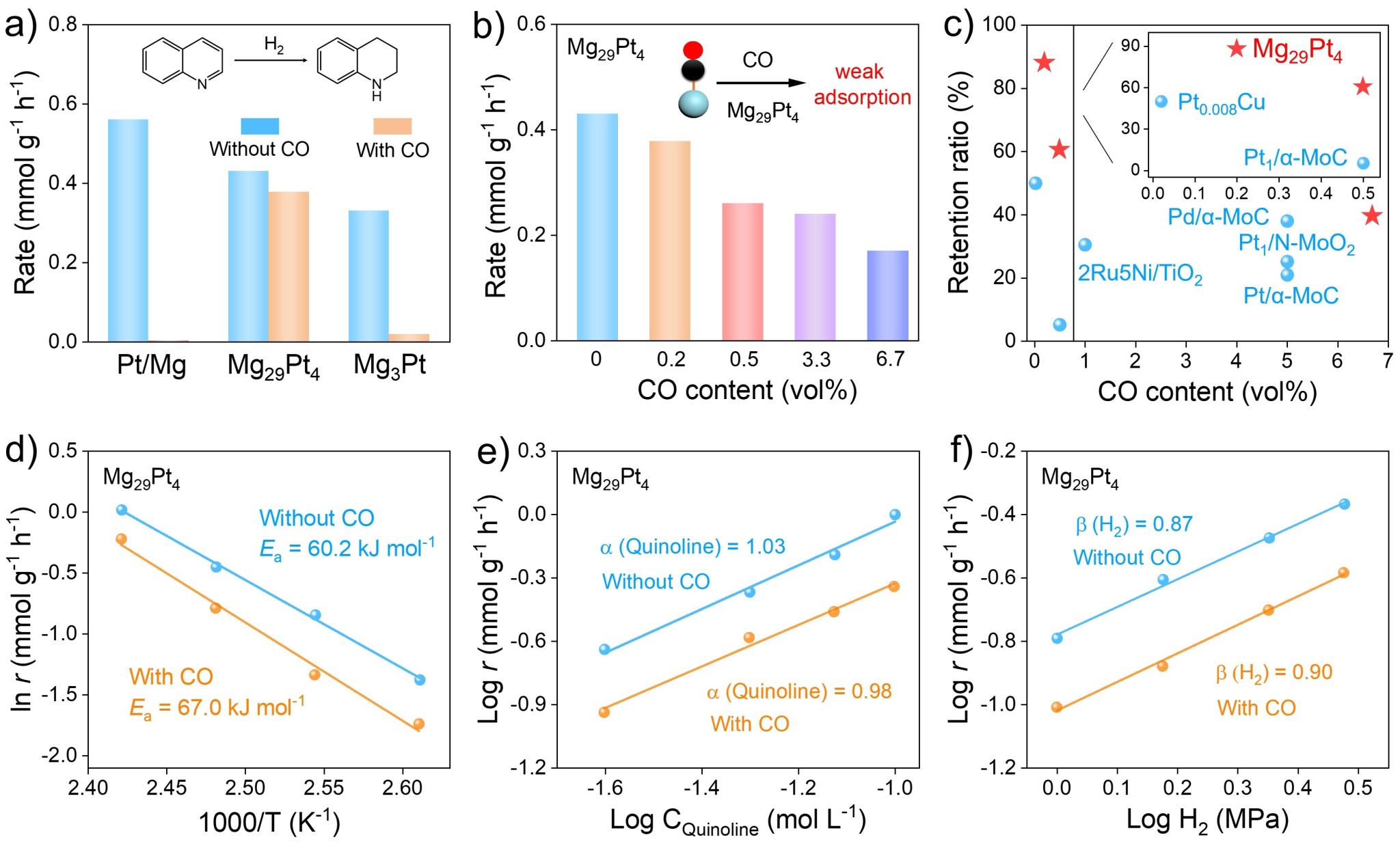 接着,作者研究CO引入对催化反应动力学的影响。如图4d-f所示,在0.5 vol% CO/H2条件下,Mg29Pt4催化喹啉加氢反应的活化能、喹啉与H2的反应级数,和纯H2条件下相近,表明CO的加入并不会改变Mg29Pt4的催化反应动力学过程,进一步证实了Mg29Pt4催化剂具有优异的抗CO毒化能力。